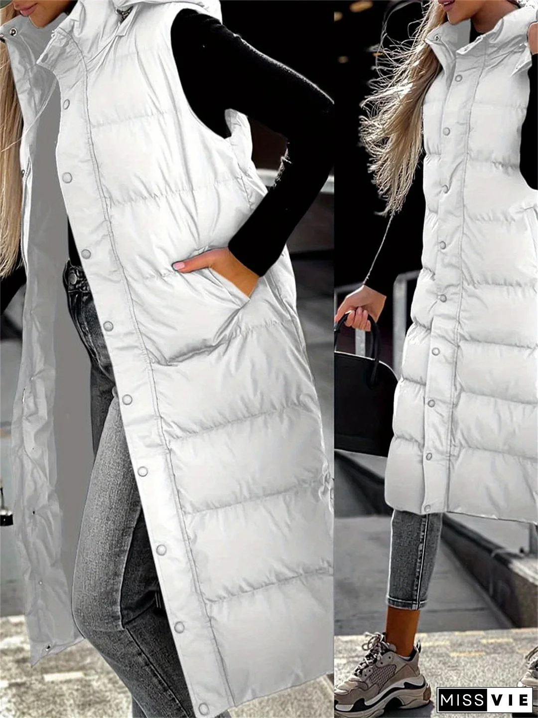A Sleeveless, Hooded, Long Quilted Vest for Women, Featuring a Button- Design And Made of Padding, Perfect for Winter., Style Clothe For Women, Vest For Dress, Vest For Women, Women Vest