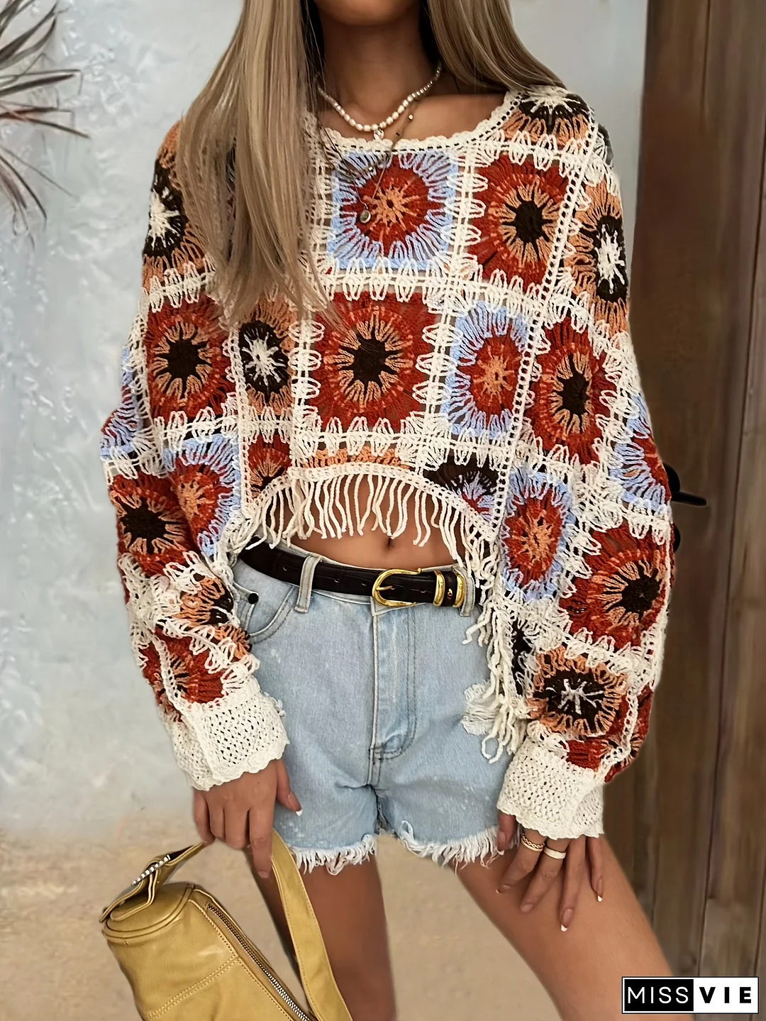 Bohemian Style Crochet Knit Cover-Up, Color Block Tassel Fringe Shawl Top, Elegant Crew Neck Beachwear for Women, Polyester 100%, Spring/Summer Collection, 160g/m² Fabric Weight
