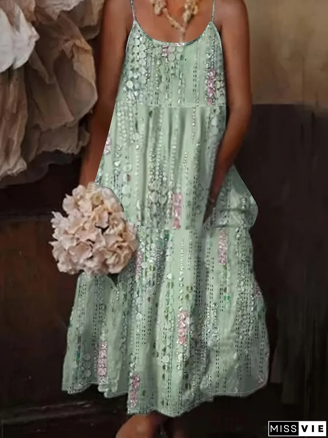 Boho Chic Mint Green Floral Print Sleeveless Maxi Dress With Thin Strappy Shoulder Straps - Casual Beach & Summer Style, Lightweight Polyester Fabric, Machine Washable, Beach Dress