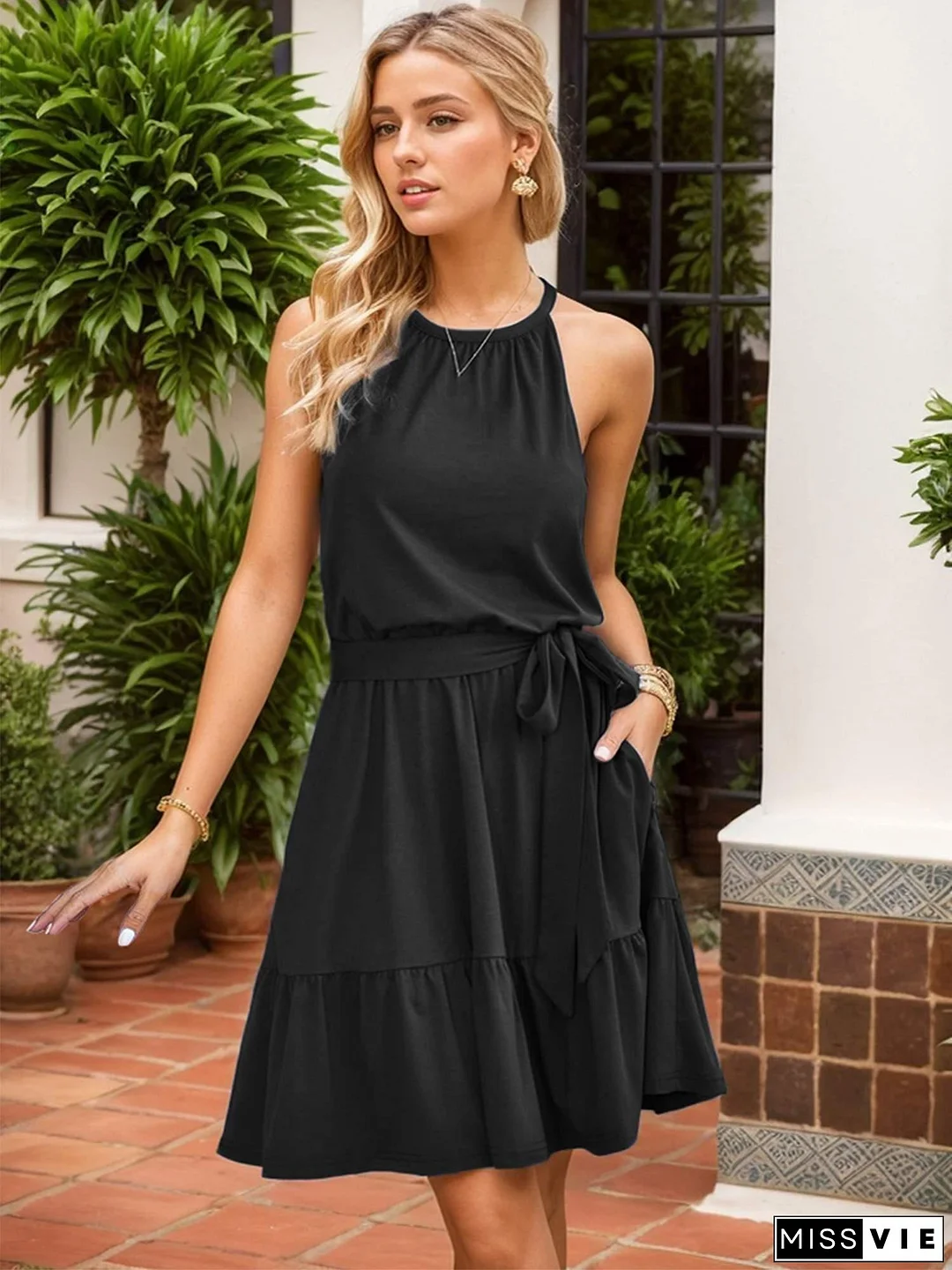 Elegant Halter Neck Knee-Length Dress For Women, Polyester Blend With Rayon And Spandex, Sleeveless Peplum Style, Solid Color, Knit Fabric, With Ruffle Detail And Flared Hem, For Summer