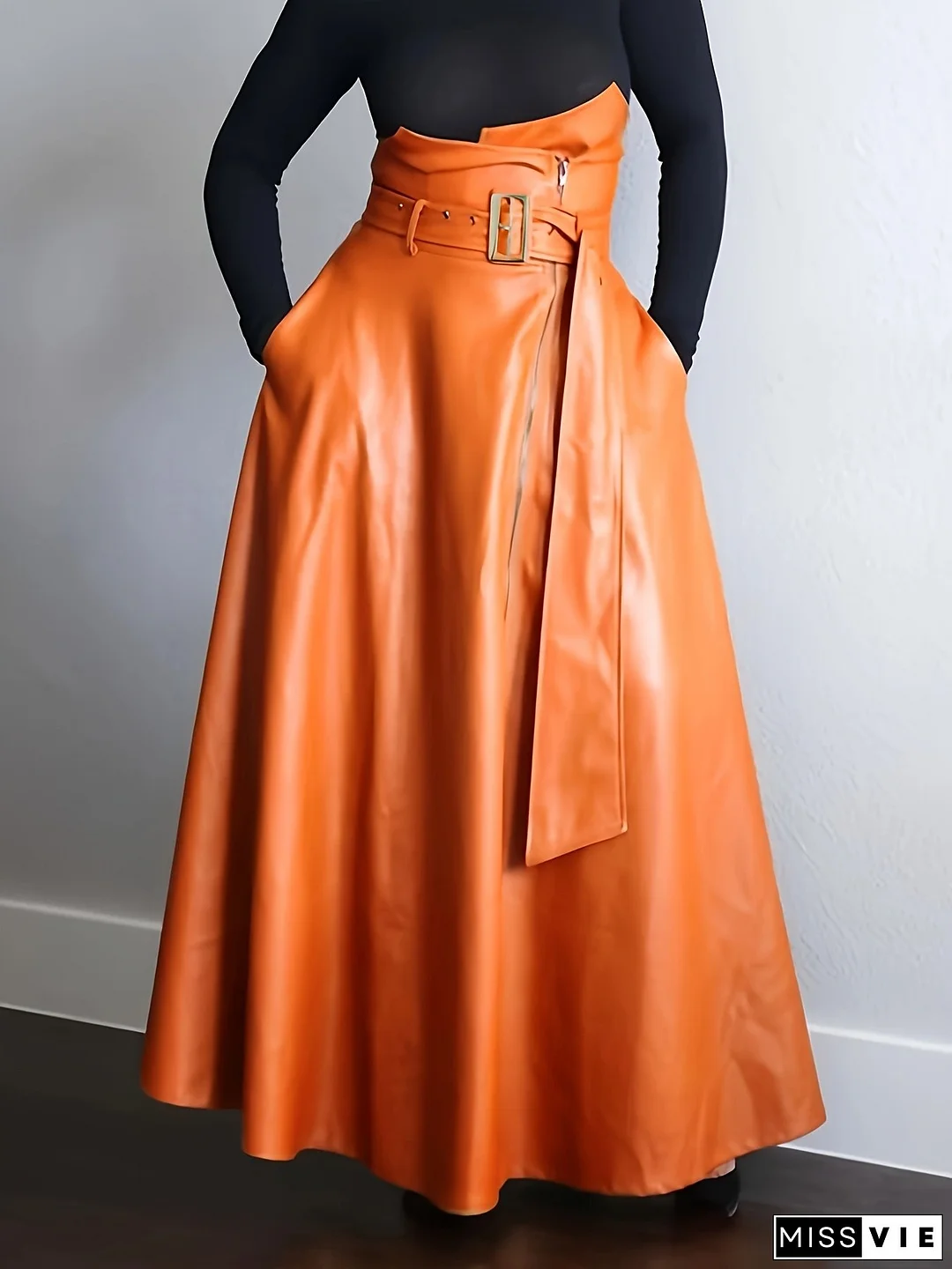 Elegant High-Waisted Synthetic Leather Skirt with Side Zipper Pockets & Adjustable Belt - Stylish A-Line Cut for Women, Vibrant Orange Synthetic Leather, Perfect for Spring/Fall, High Waisted Skirt
