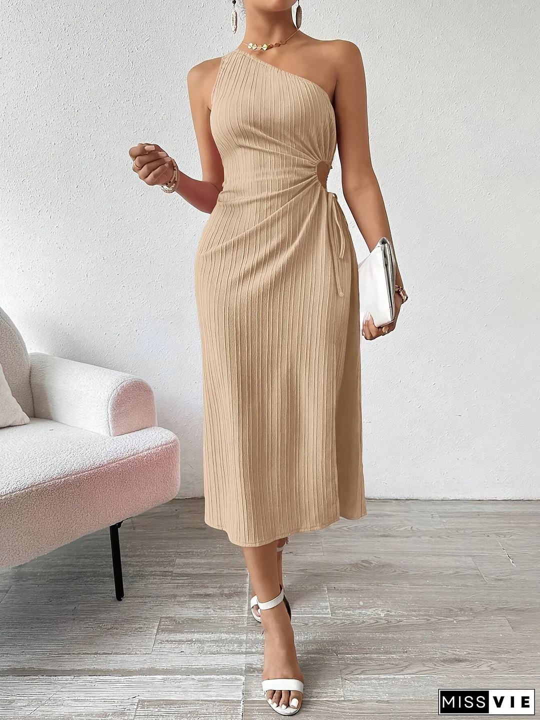Elegant One-Shoulder Ribbed Midi Dress For Women - Sleeveless, Beige Striped Texture, Side Slit, Machine Washable, Polyester Blend, Perfect For Casual Or Formal Occasions