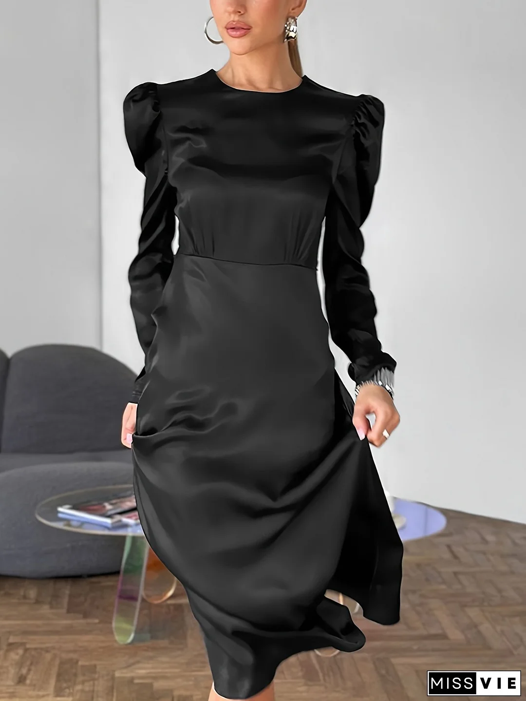 Elegant Satin Midi Dress for Women - Long Sleeve Lantern Puff Sleeves, Bodycon Fit, Crew Neck, Solid Color, Zipper Detail, Polyester, Woven Fabric, 180g/m² - Perfect for Adult Spring/Summer/Fall