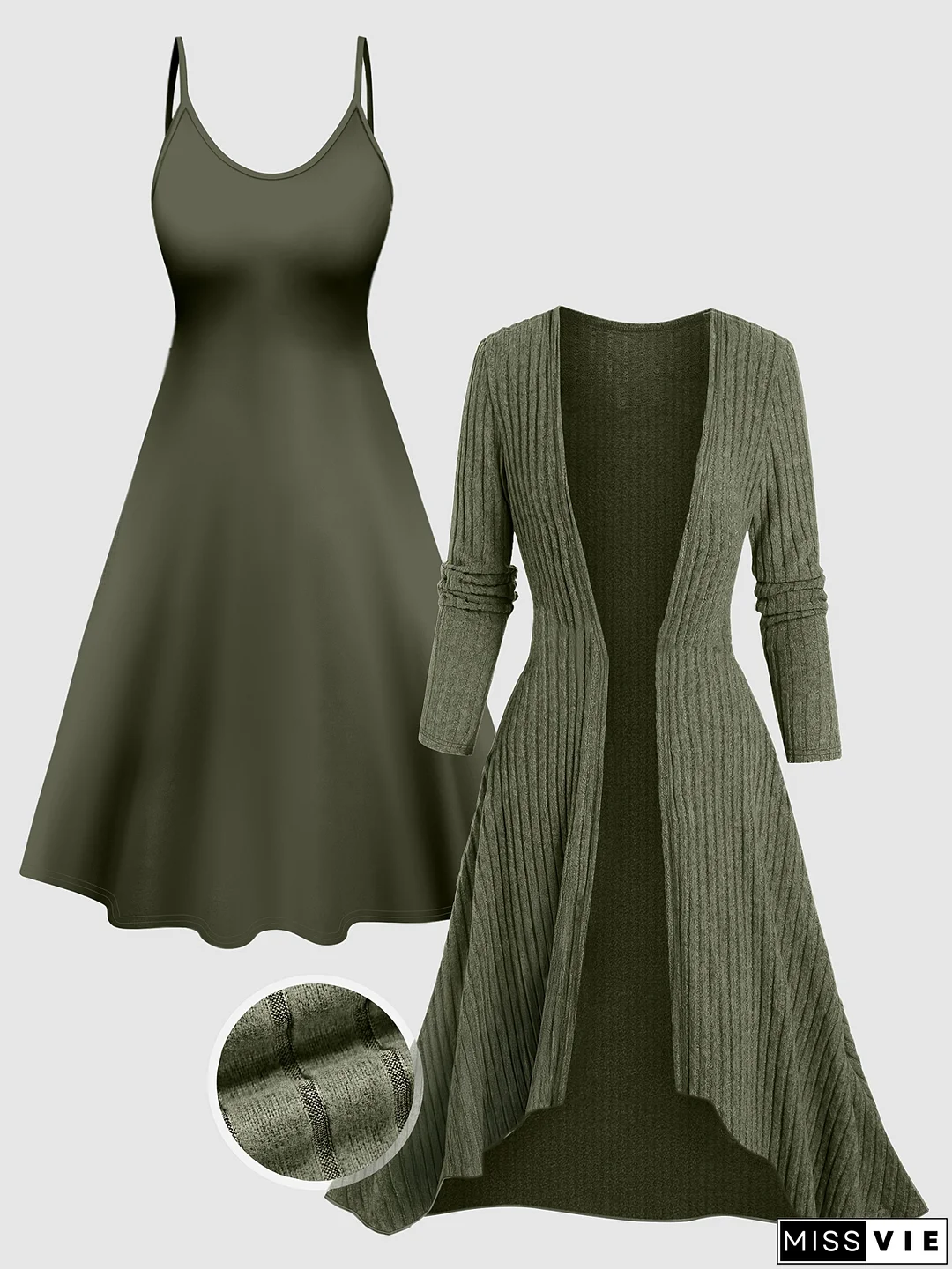 Fashion Women'S Solid Color Knitted Cardigan Mid-Length Top with Halter Dress 2pcs Elegant Suit