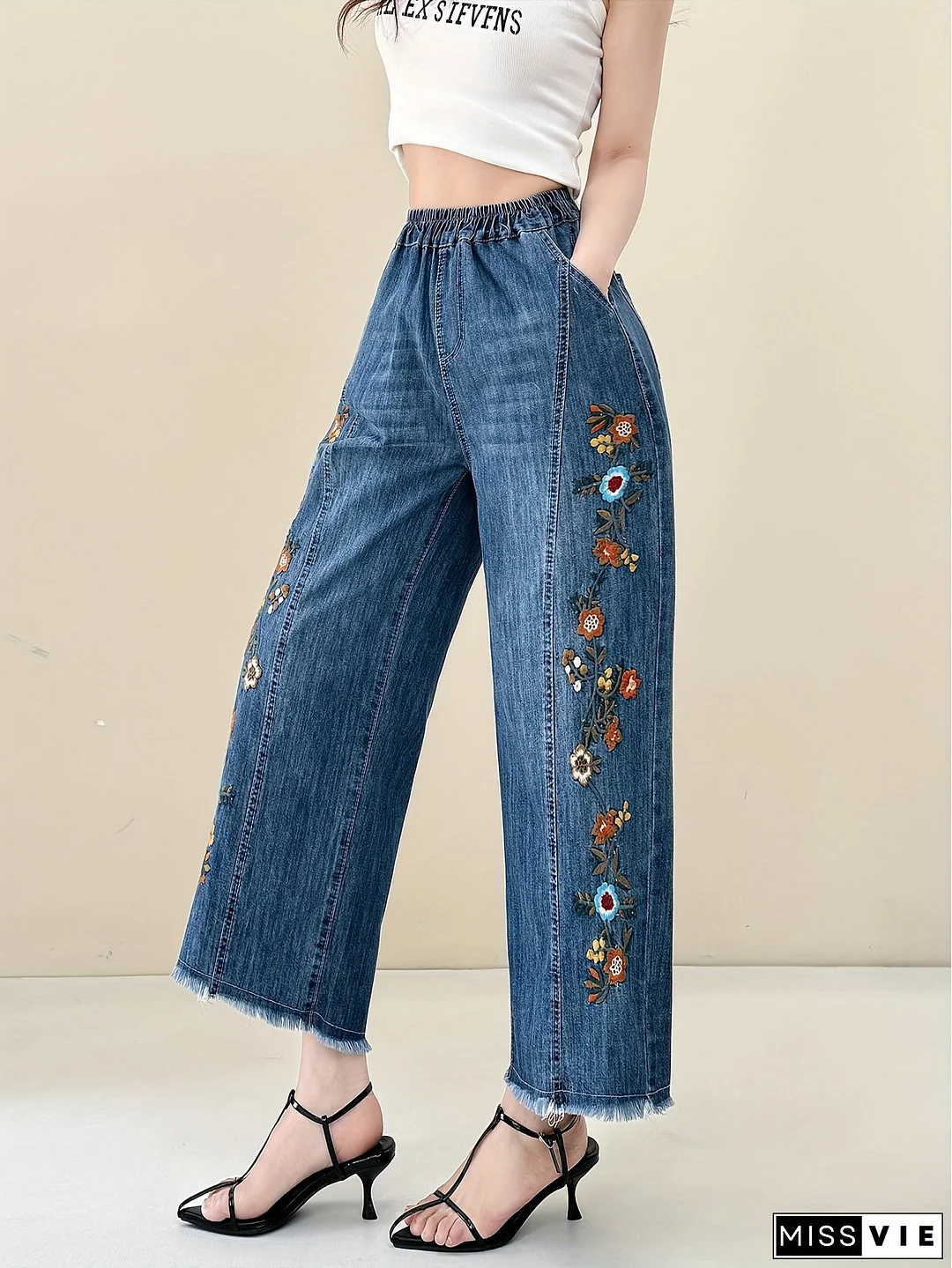 Floral Embroidery Lightweight Cropped Baggy Jeans with Raw Hem for Women, Elastic Waist Ripped Wide And Straight Jeans for Spring Summer And Autumn, Relax Fit Cropped Denim Pants for Everyday & Formal Out Fit, 2025 New Design