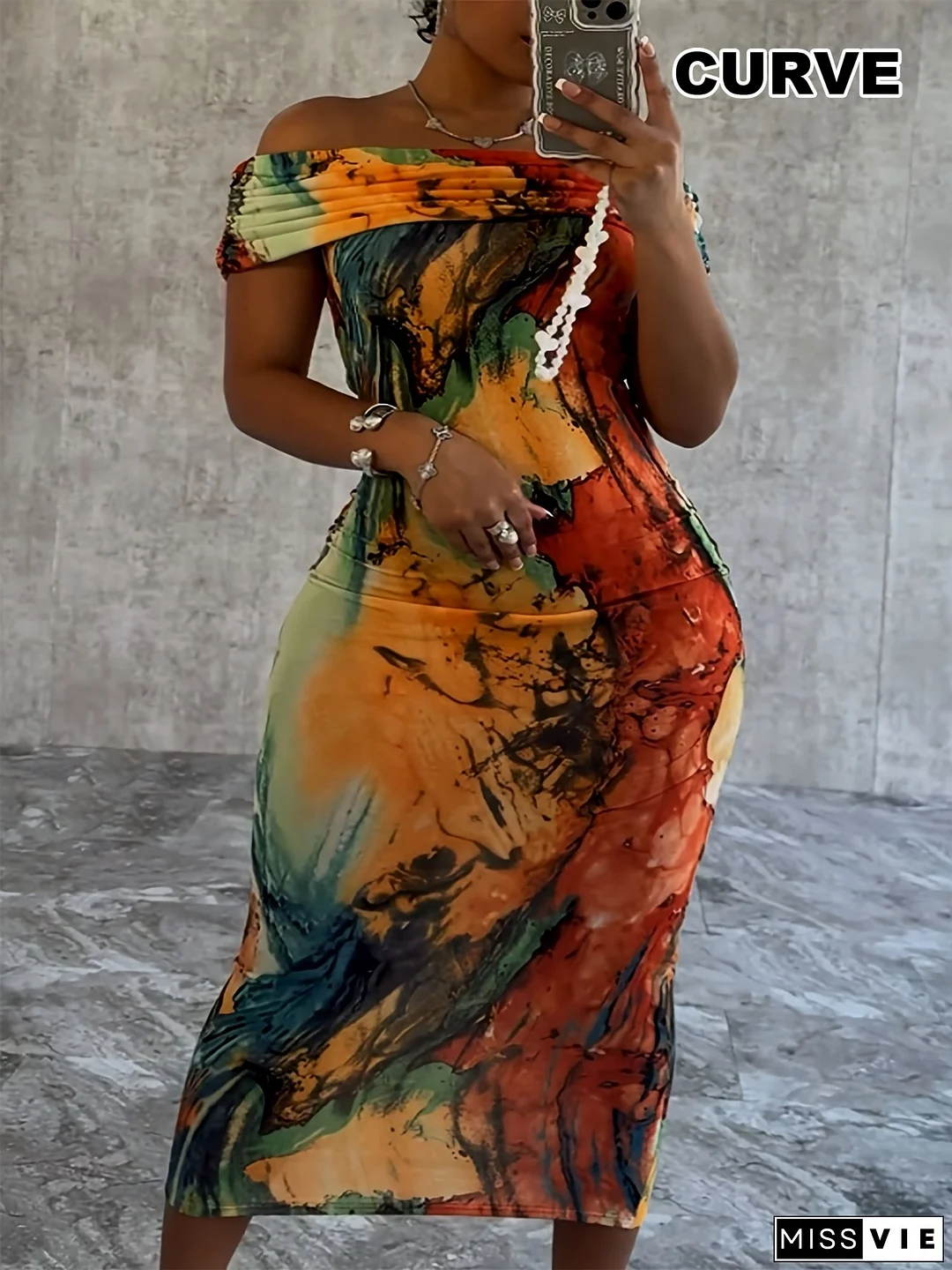 Plus Size Women's Elegant Off-Shoulder/One-Shoulder Dress - Vibrant Abstract Print, Fitted Silhouette, Machine Washable, Spring/Summer Party & Valentine's Day Outfit, Spring Fashion, Trendy Fashion, Durable Construction, Fashion Lovers