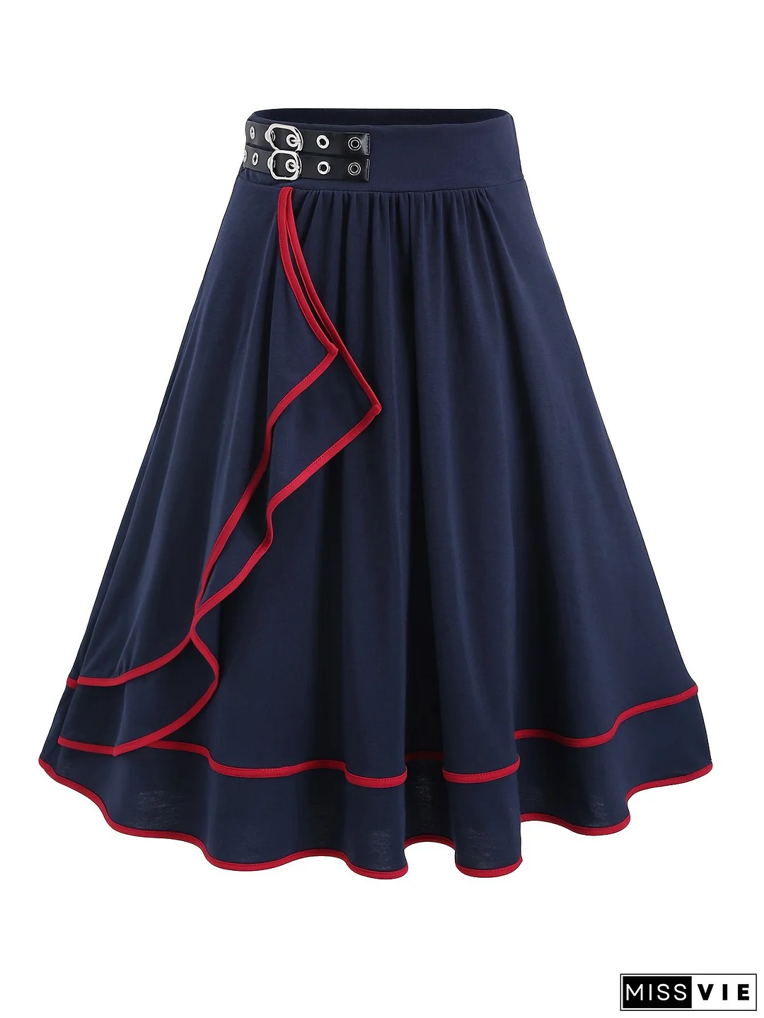 PU Contrast Color Belt with Ring Buckle and Ruffle Pleated Mid-Long A-Line Skirt