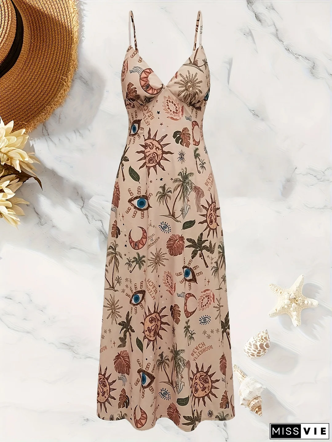 Vintage Floral Print Maxi Dress With V-Neck And Adjustable Spaghetti Straps - Sleeveless, Flowy Summer Dress For Women, Beige/Black, Polyester Lining, Perfect For Casual Outings