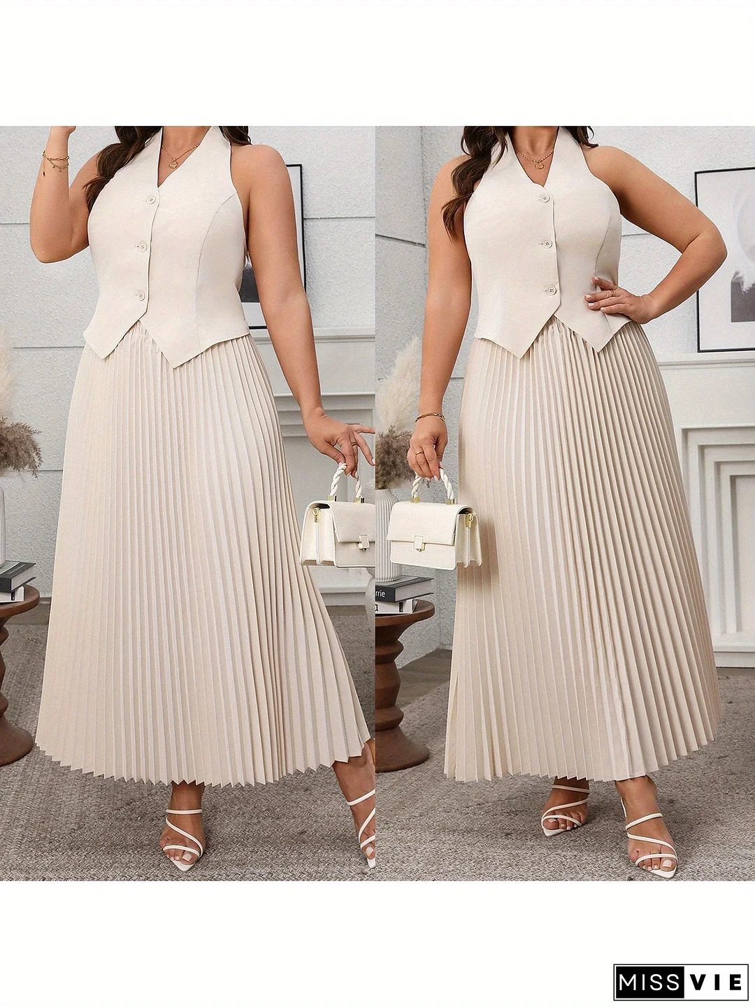 Women Summer Plus Size Outfits Solid Color V-Neck Button Halter Vest And Pleated Skirt Set For Streetwear