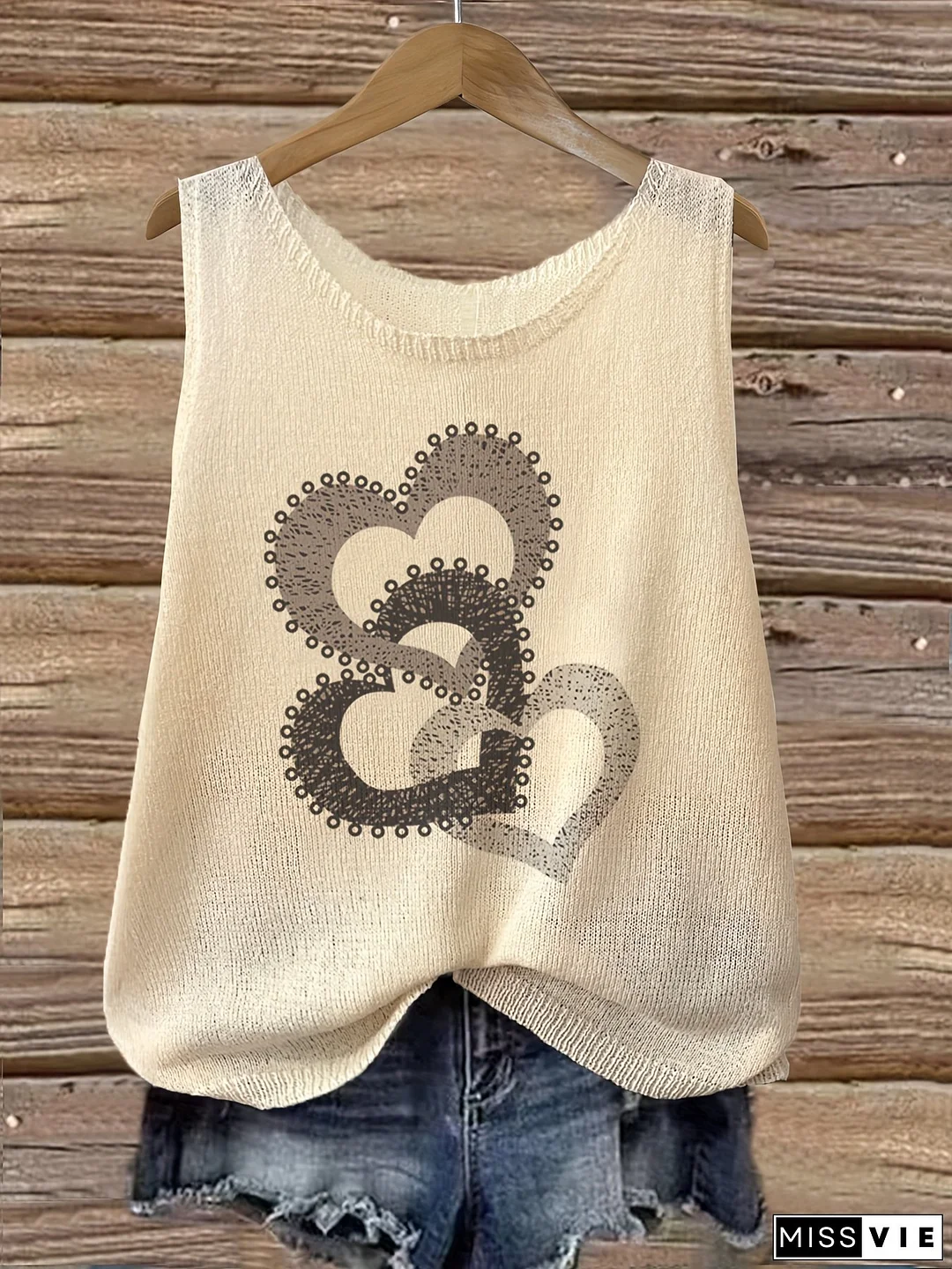 [Summer Tank Top] Breathable Summer Tank Top | Women's Casual Round Neck Heart Print Semi-Sheer Ribbed Sleeveless Top With Stretch Fabric, Brown & Black Graphic Design For Layering Or Standalone Wear, Medium Elasticity