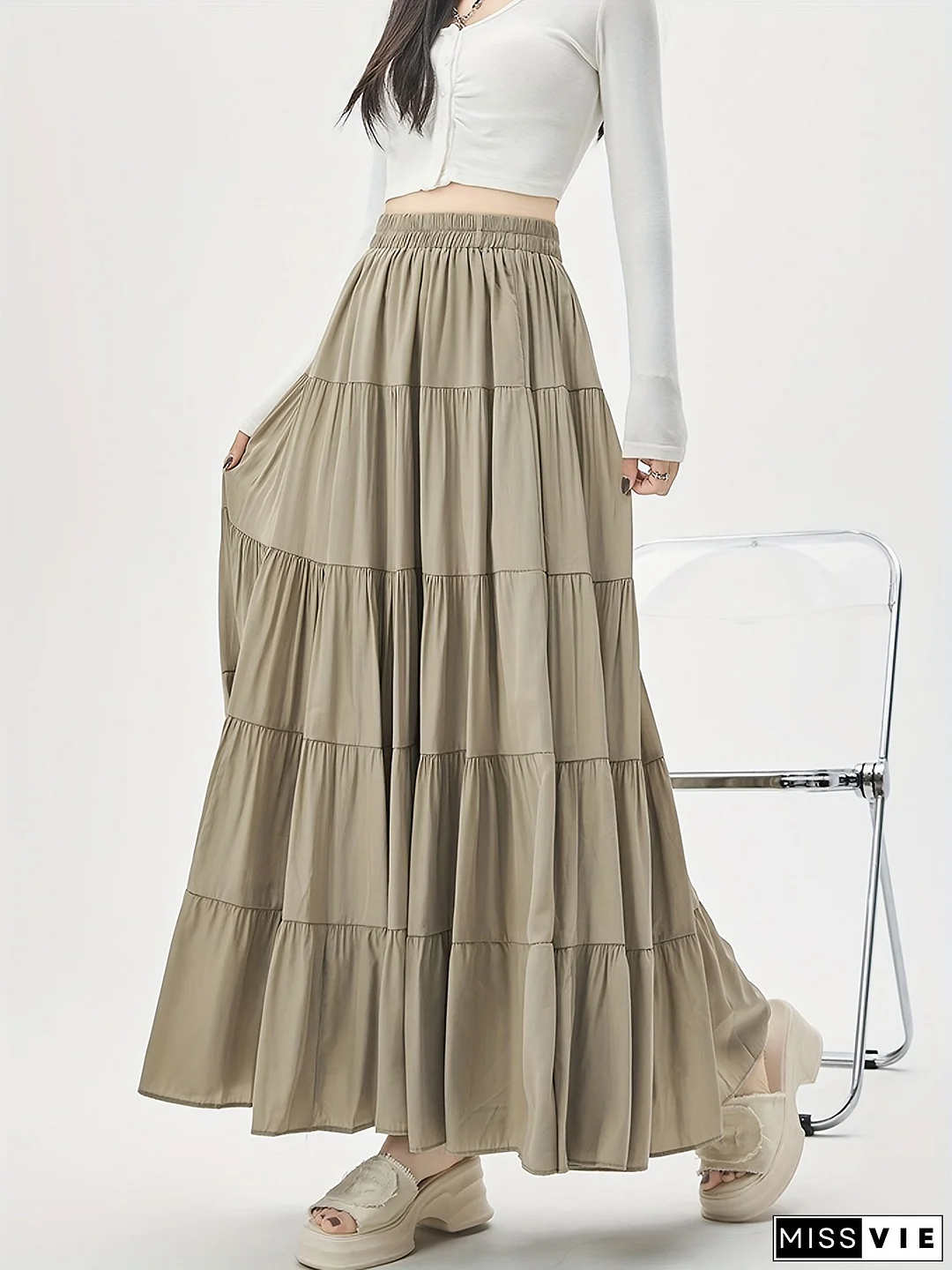 [Elegant A-Line Skirt] Women's Elegant Solid Color A-Line Long Skirt, Elastic Waist, Layered, Flared Hem, Polyester 100%, Lightweight 50/110 g/m², Woven, Spring/Summer/Fall Fashion