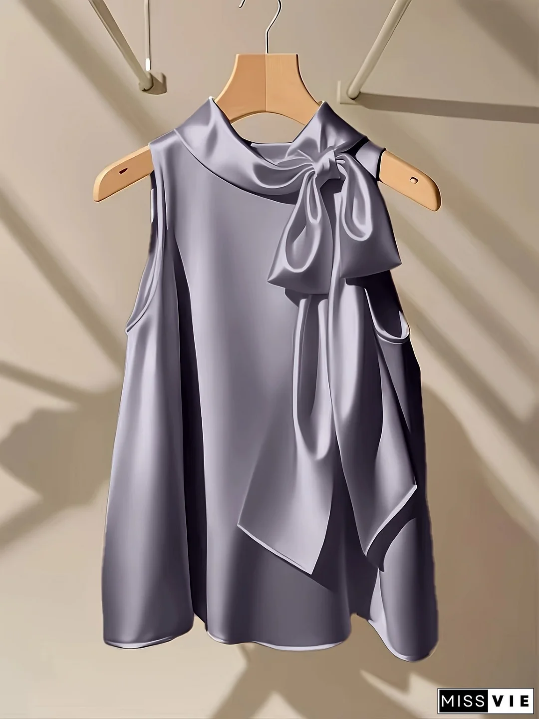 [Elegant Blouse] Mint Green Silky-Like Polyester Blouse | Women's Elegant Round Neck Sleeveless Top, Machine Washable Solid Color Shirt for All-Season Wear with Bow Detail