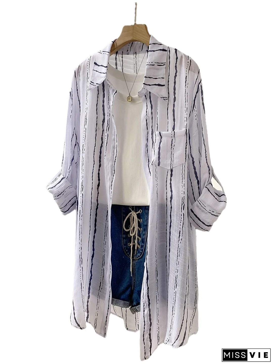 Women's Lightweight Semi-Sheer Striped Long Sleeve Shirt - Relaxed Fit Collar Button-Up Cardigan with Pockets, All-Season Casual Chic Office Wear, Machine Washable Loose Fit Blouse, Summer Outerwear, Wide Sleeve Design, Subtle Pattern Detail