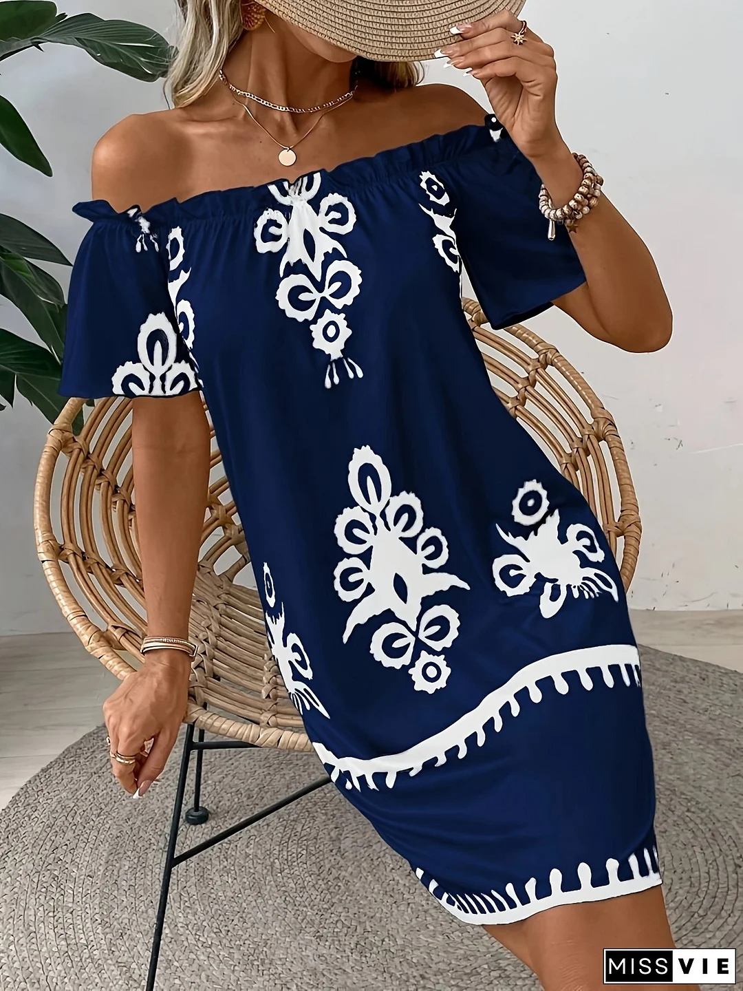 [Elegant Off-Shoulder Dress] Lightweight Polyester Blend Women's Off-Shoulder Dress | Paisley Print, Lace Trim, A-Line, Ruffled Sleeve - Elegant Ruffled Design for Spring Summer Parties, Beach Vacations & Holiday Gatherings