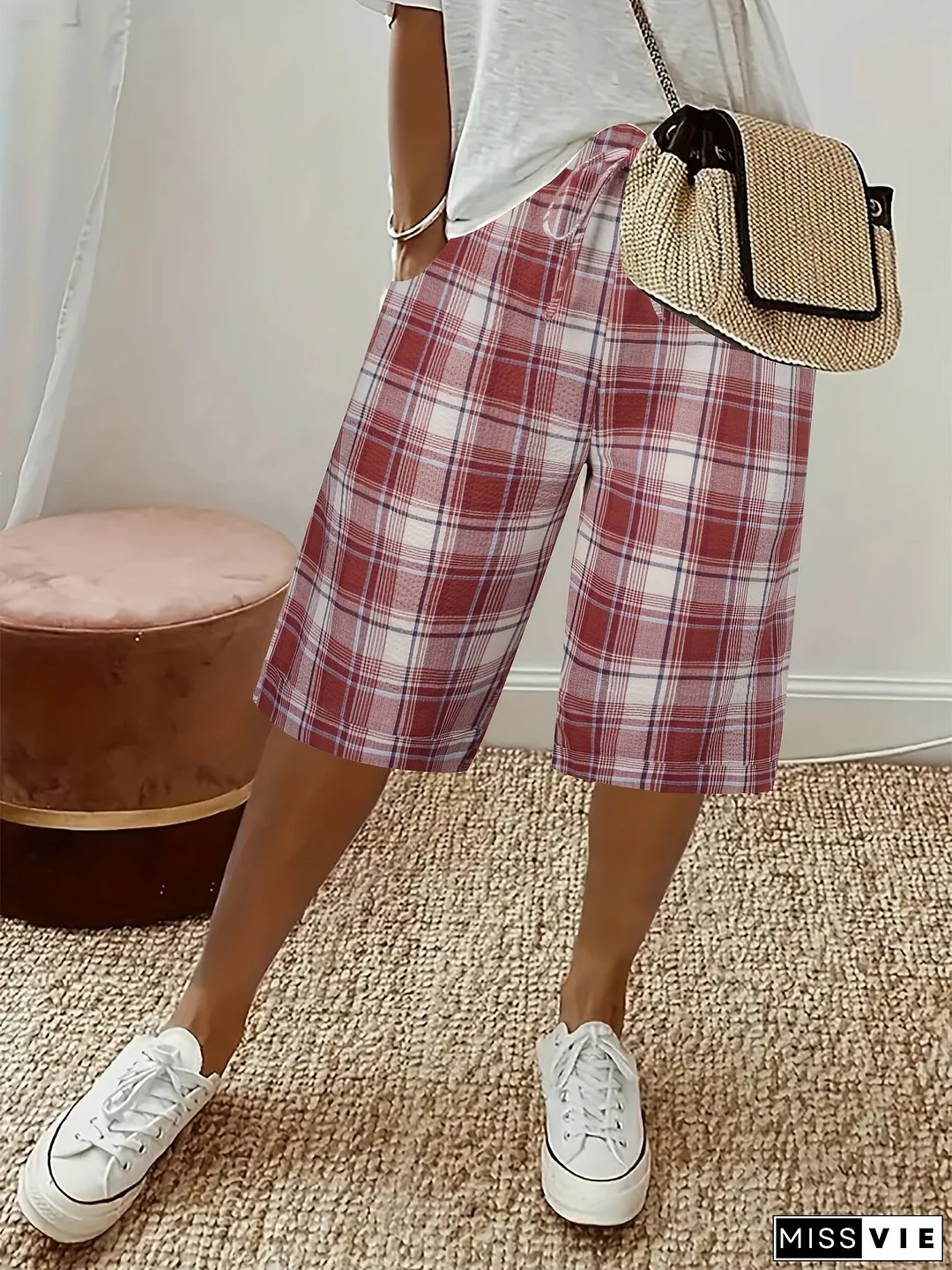 Women'S Plus Size Red Plaid Bermuda Shorts, Elegant Polyester 100% Non-Stretch Straight Leg with Fake Drawstring, All-Season Woven Fabric, 135 gsm - Casual Summer Fashion