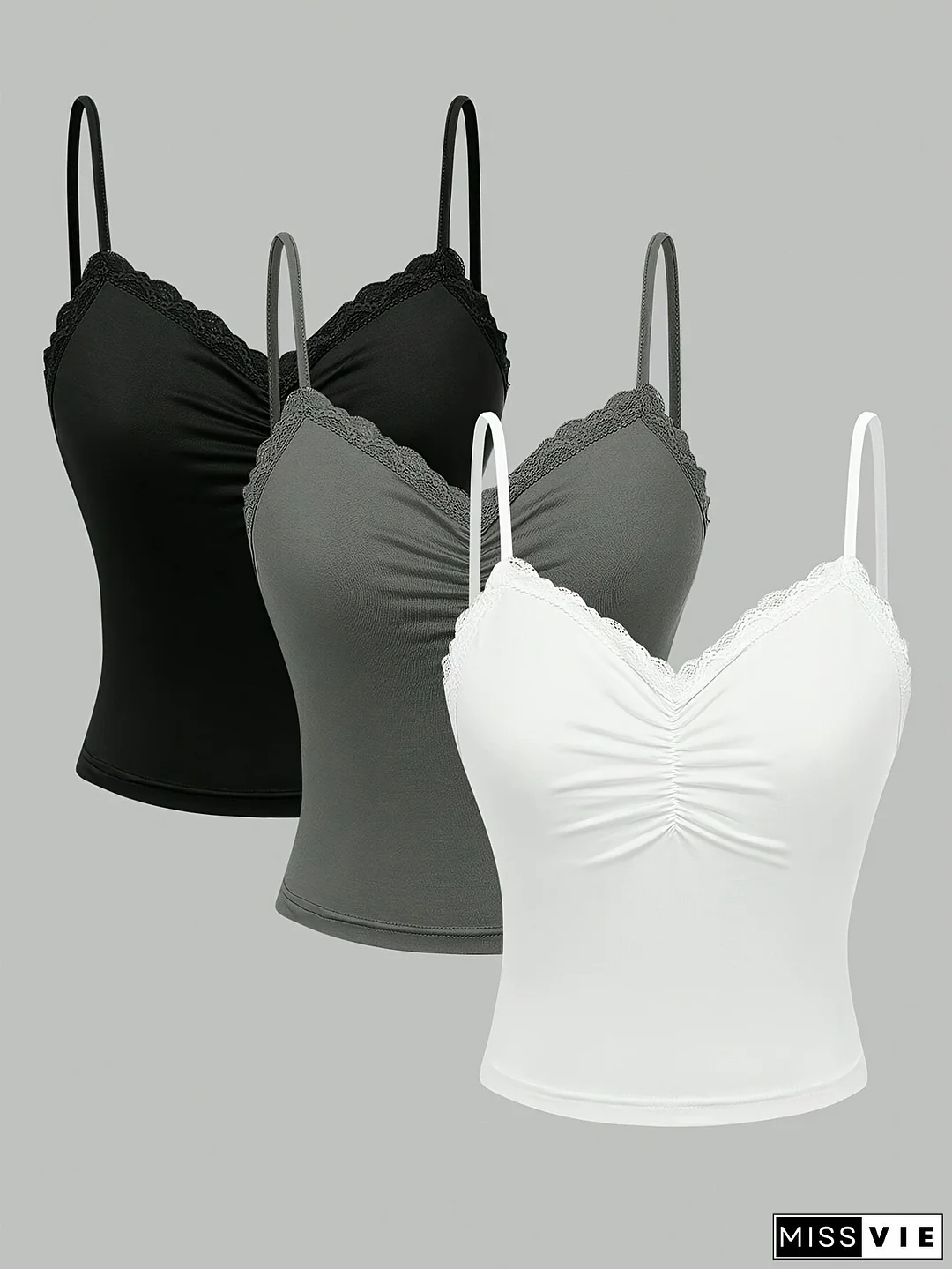 Women's Solid Color Simple Thin Shoulder Strap Contrast Lace Three Piece Set Top 439T-2