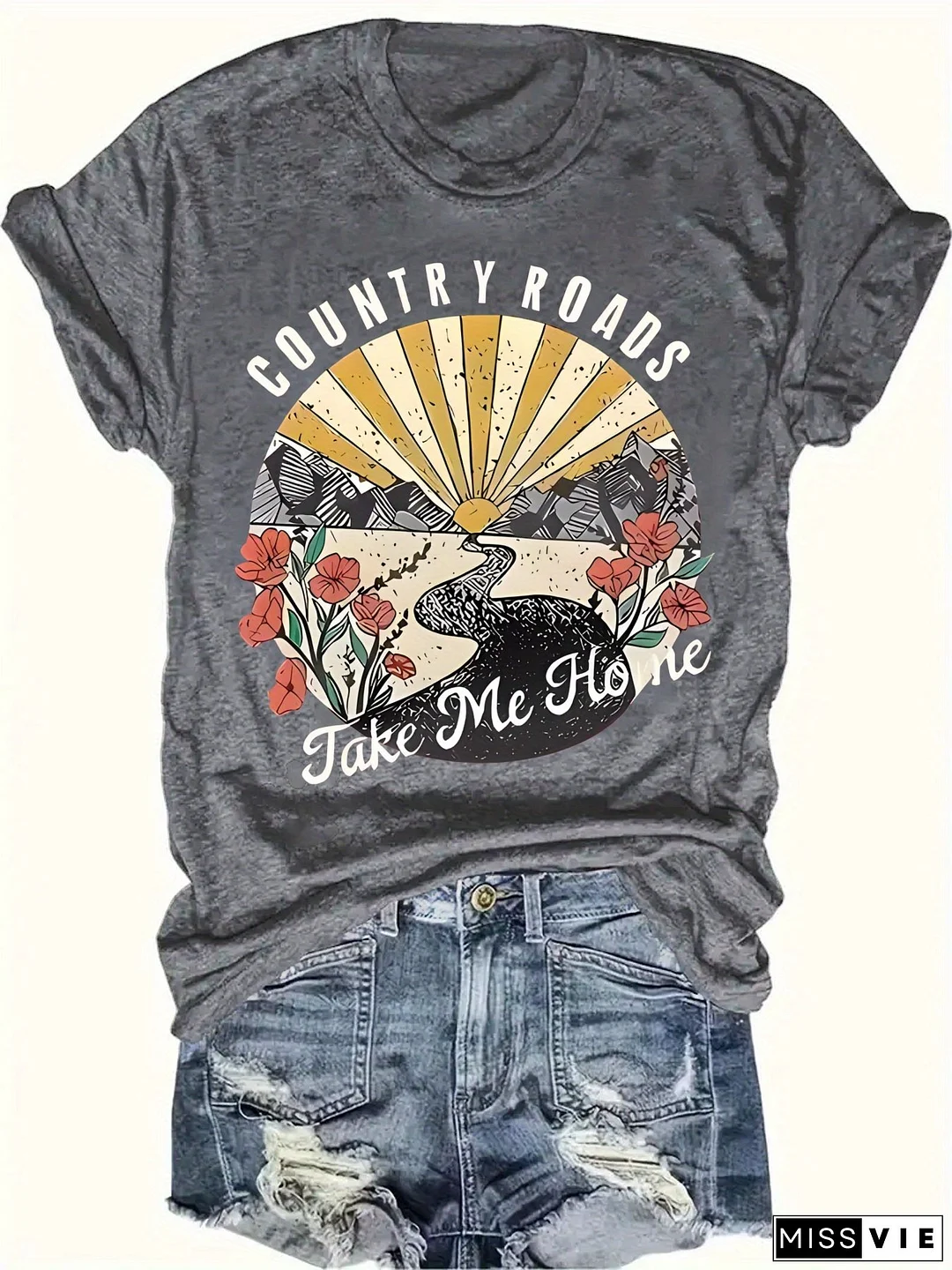 Women's Vibrant Red Graphic Print T-Shirt - Country Roads Take Me Home Design With Sun Rays, Birds & Floral Motifs, Short Sleeve Crew Neck Casual Top, Machine Washable Regular Fit For Summer & Spring, Everyday Comfort, Sunburst Design, Comfortable Tee