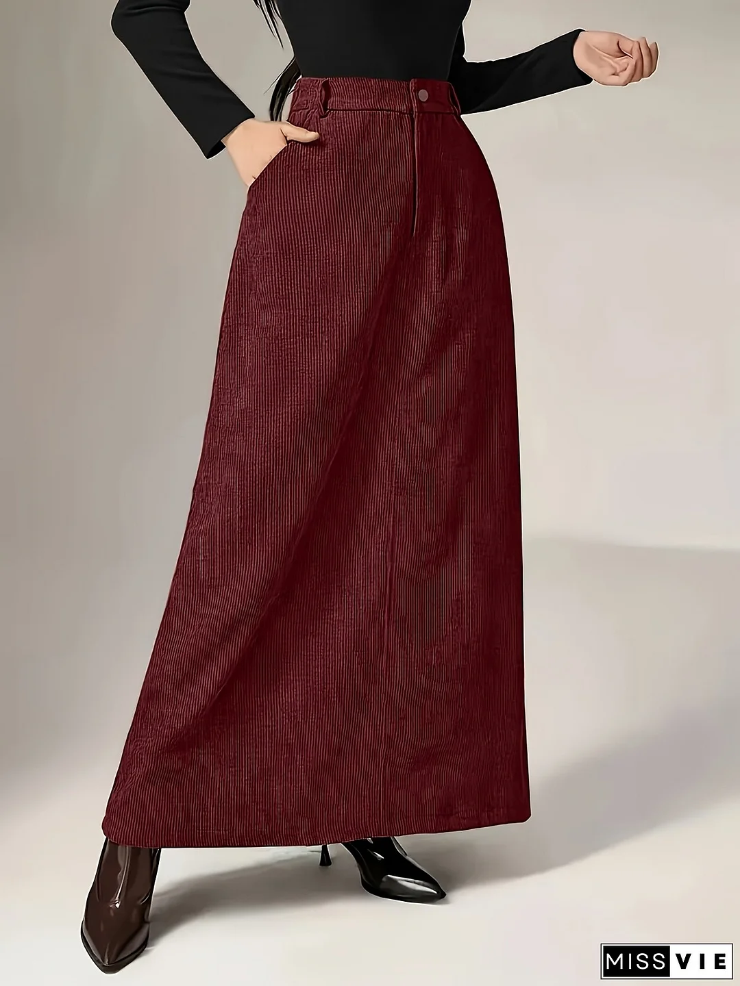 [Vintage Corduroy Skirt] High-Waist Vintage Corduroy Skirt With Pockets - Polyester 100%, Skinny Fit, Solid Color, Long Length For Spring/Fall - Versatile Workwear