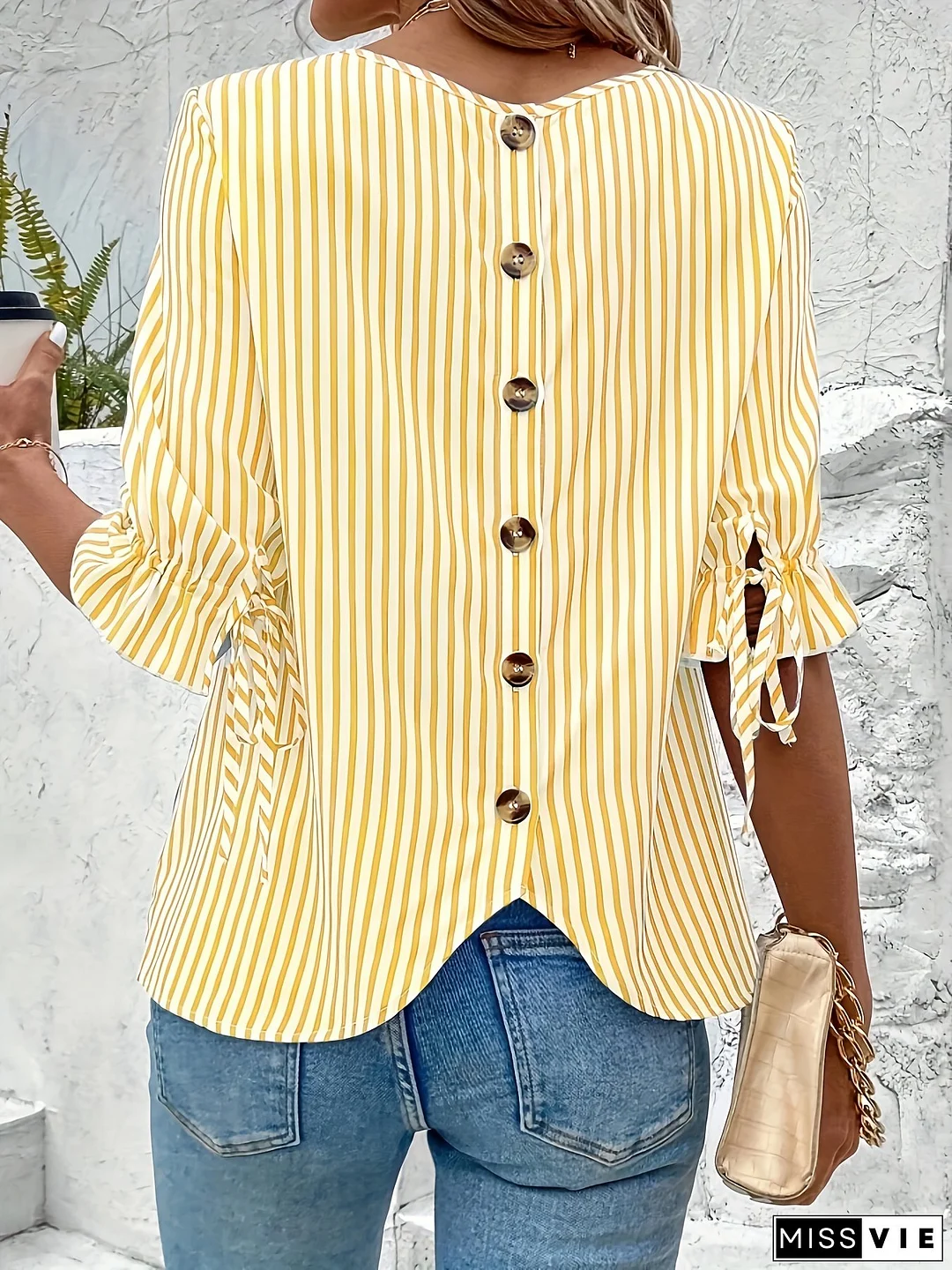 YY0425977 Fashion Striped Print Round Neck Shirt, Elegant Half-Sleeve Button-Back Blouse for Women